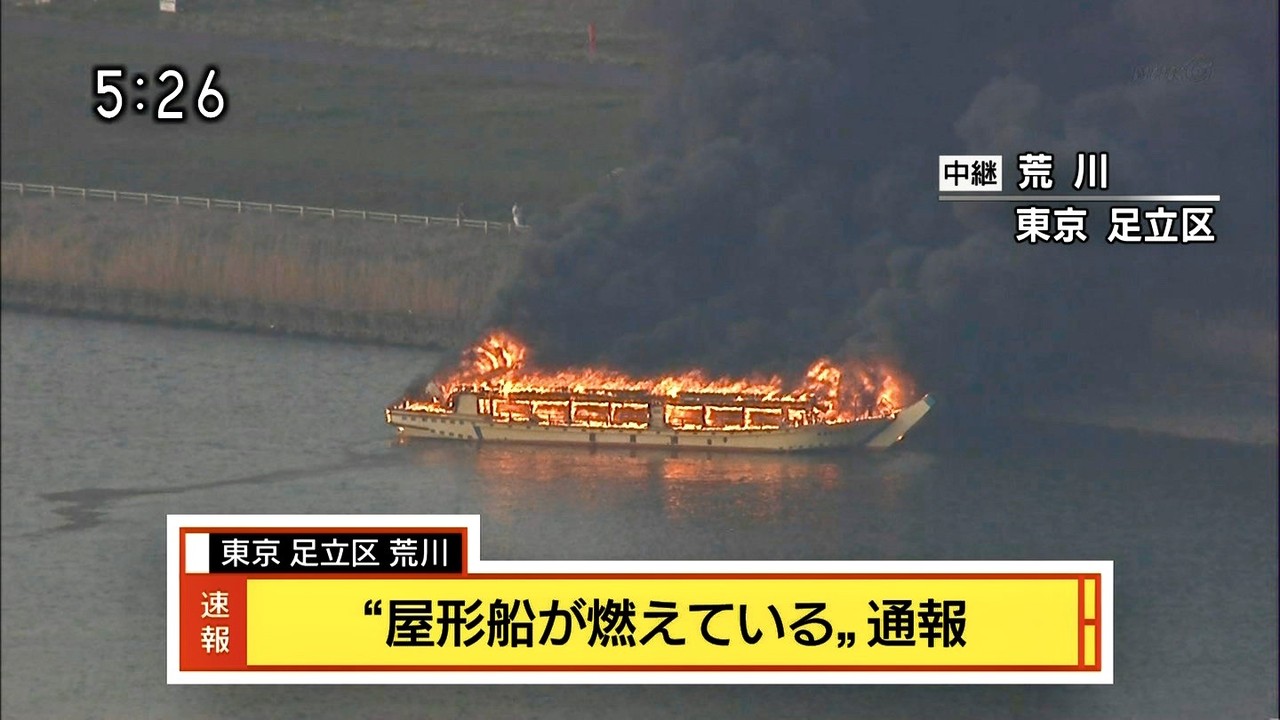 【速報】荒川で炎上 屋形船